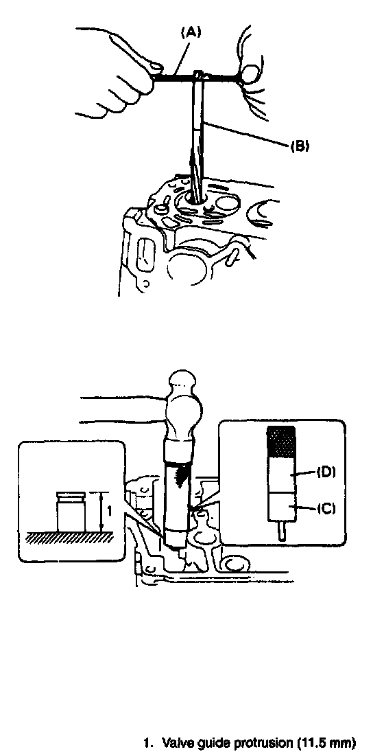 Heat cylinder head uniformly at a temperature of 80 to 100°C (176 to 212°F) so that head will not be distorted, and drive new valve guide into hole with special tools. Drive in new valve guide until special tool (Valve guide installer) contacts cylinder head. After installing, make sure that valve guide protrudes by 11.5 mm (0.45 inch) from cylinder head.
