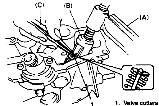3. Using special tool (Valve lifter), compress valve springs and then remove valve cotters by using special tool (Forceps) as shown.