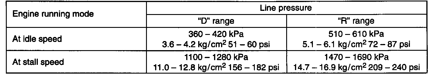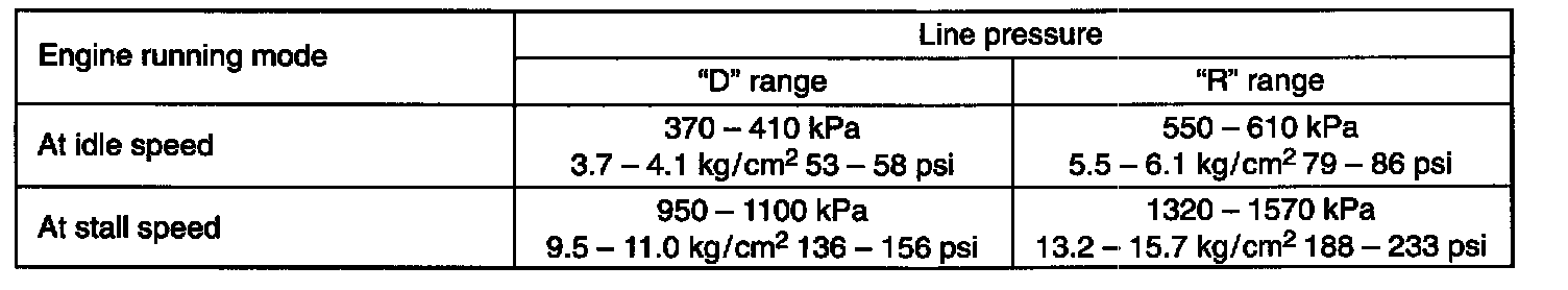 5. Depress foot brake fully, run engine at idle and stall and then check fluid pressure in "D" or "R" range.