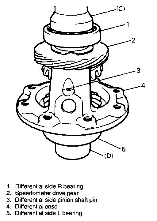 5. Install speedometer drive gear, support differential assembly as illustrated so as to L bearing is floating, and then press-fit R bearing like L bearing in Step 4).