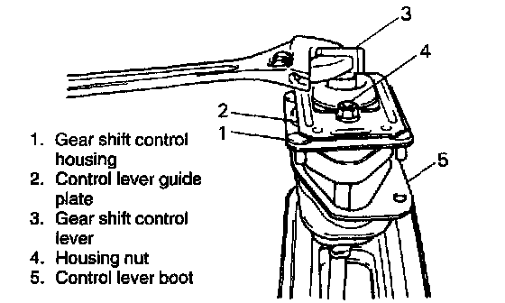 2. Remove 4 control lever housing nuts and then push shift control lever boot(s) into floor hole to take out shift control lever assembly from under the floor.
