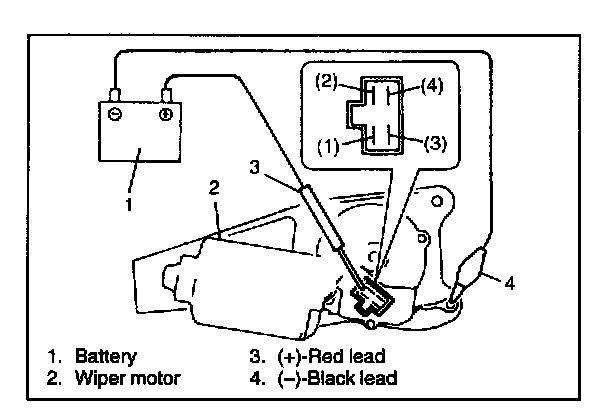 WIND SHIELD WIPER MOTOR1. As illustrated, use a 12 V battery to connect its (+) terminal to (1) terminal, and its (-) terminal to Black lead cord. If motor rotates at a low revolution speed of 47 to 57 rpm, it is proper. As for high speed check, connect battery (+) terminal to 2. terminal, and its (-) terminal to Black lead cord. If motor rotates at a high revolution speed of 70 to 84 rpm, it is proper.
