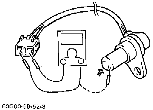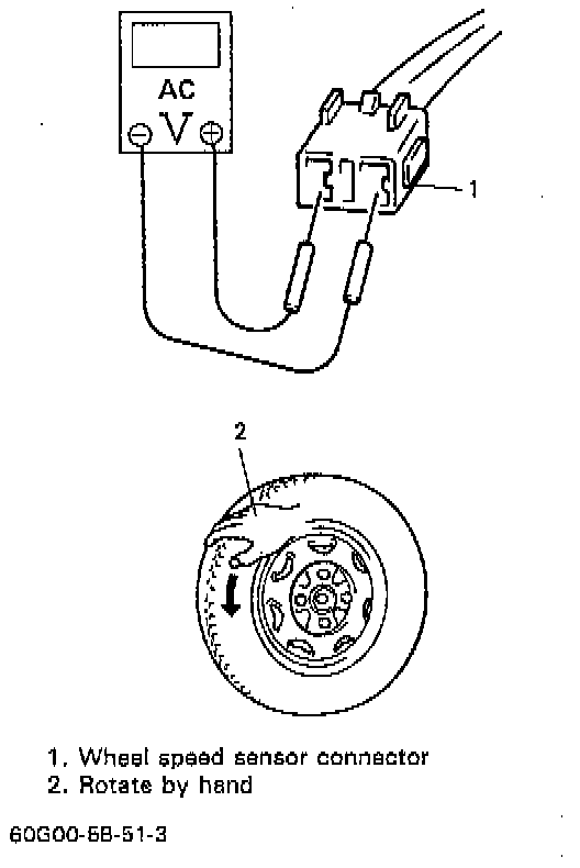 5. While turning wheel at a speed of approximately 2/3 to 1 full rotation per second, check AC voltage of sensor, which should be (29-44 Hz): 150 mV or more If measured voltage is not as specified, check sensor, rotor and their installation conditions.