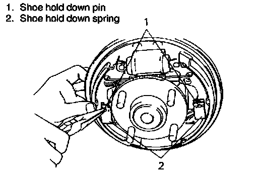 2. Remove shoe hold down springs by turning shoe hold down pins.