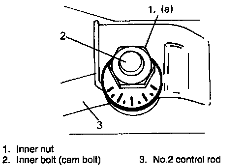2. Adjust toe to satisfy specification by turning right and left No.2 control rod inner bolts (cam bolts) by the same amount.