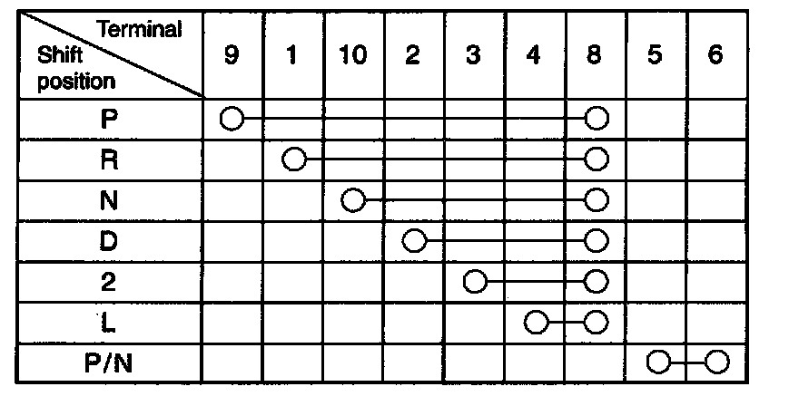 2. At each of P, R, N, D, 2 and L shift position, check continuity between terminals as well as each terminal and switch case. Continuity should be indicated only between those terminals as shown in table at each shift position. Continuity should not exist between any terminal and switch case. If malfunction is found, adjust or replace.