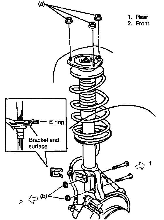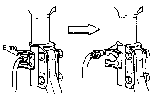 3. Remove E ring securing brake hose and take brake hose off strut bracket as shown.