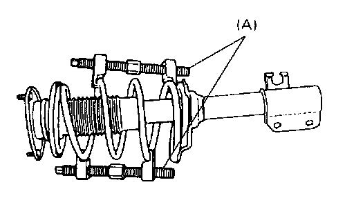 1. With special tool (A) placed to spring as shown, turn special tool bolts alternately until spring tension is released. Whether it is released or not can be known by whether strut turns lightly while strut spring is held stationary.