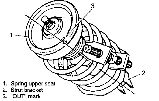 5. Install spring seat on coil spring and then spring upper seat aligning "OUT" mark on spring upper seat and center of strut bracket.