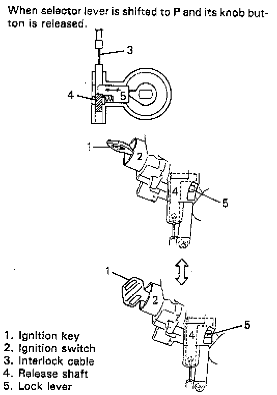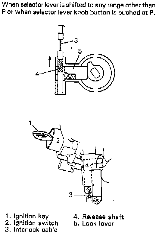 This system is so designed that select lever cannot be shifted from "P" range position unless the ignition switch is turned to "ON" and brake pedal is depressed. Also, ignition key cannot be pulled out of key hole unless selector lever is in "P".