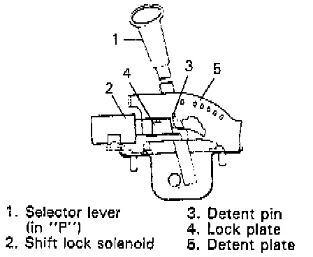 When the select lever is in "P" range, the ignition key position is "ON" and depressing the brake pedal cause the electric current to flow to the solenoid. As the lock plate is drawn toward the solenoid in this state, it frees the detent pin, which then allows the select lever to be shifted from "P" range to any other position.