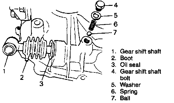 6. Remove gear shift shaft bolt with washer, then take out spring and steel ball.