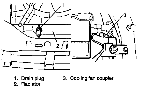 4. Disconnect radiator inlet and outlet hoses and reservoir tank hose from radiator.