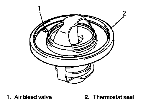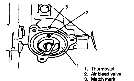 1. When positioning thermostat on water pump case, be sure to position it so that air bleed valve comes at match mark and into the recession of water pump case.