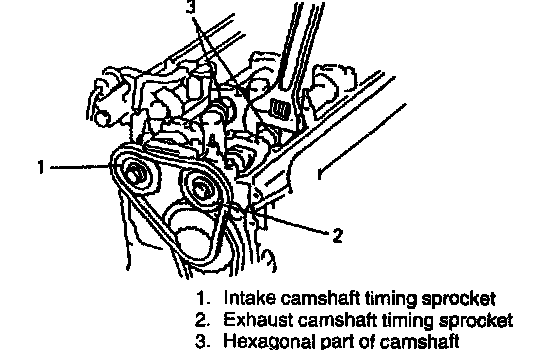 6. Install intake and exhaust camshaft timing sprocket bolts. To install it, fit a spanner to hexagonal part at the center of camshaft to hold it stationary.