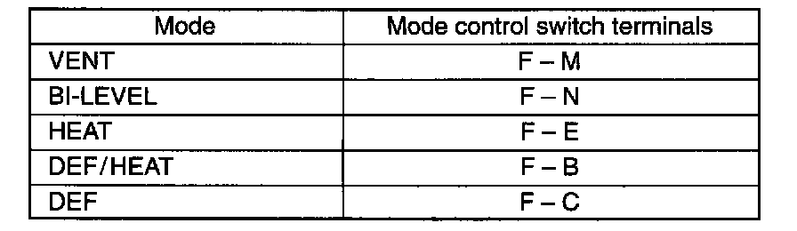 Mode Control Switch- Check if continuity exists between each pair of terminals listed below when mode control button is pressed.