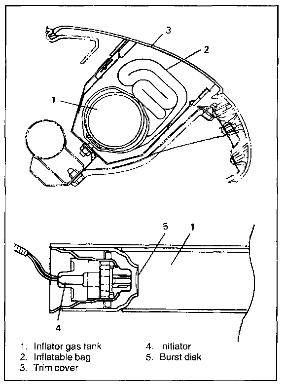 Driver inflator consists of initiator, burst disk and inflator gas tank. When vehicle is in a frontal crash of sufficient force, SDM causes current to flow through driver deployment loop. Current passing through the initiator causes a chemical reaction to occur. This chemical reaction generates pressure, depressing a burst disk which releases stored gas rapidly inflating air bag.