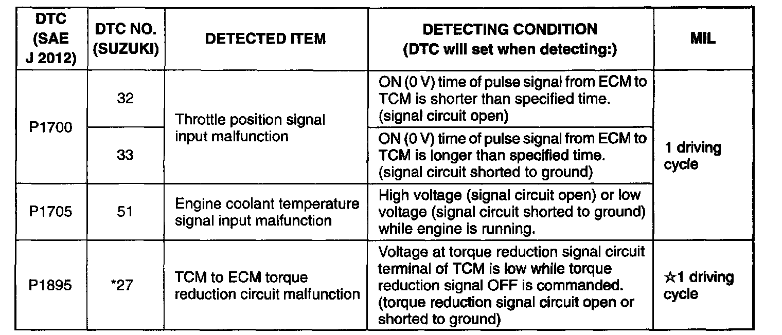 - The DTCs with asterisk in DTC NO. (SUZUKI) column can not be read with SUZUKI scan tool. Bear these in mind when diagnosing troubles.