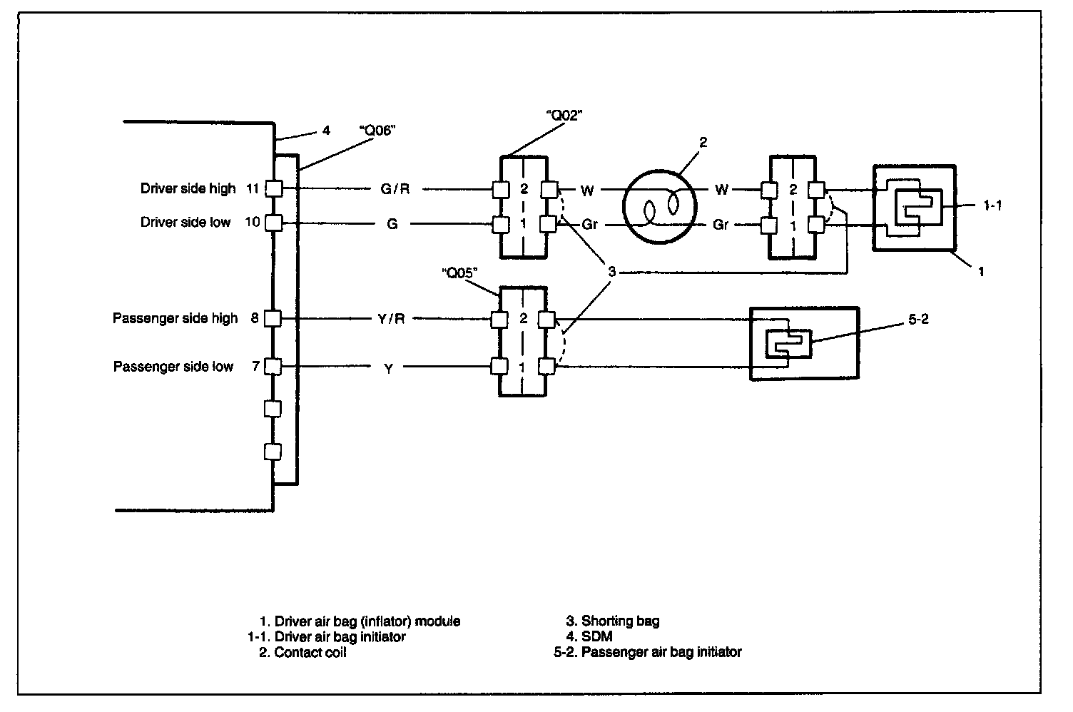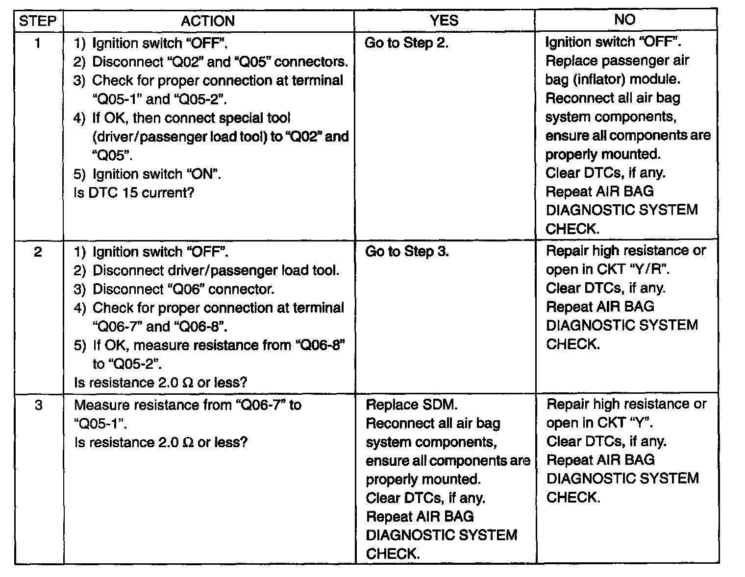 1. This test determines whether the malfunction is in the passenger air bag (inflator) module circuitry or in the SDM wiring harness circuitry.