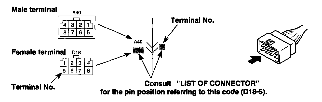 The connectors are indicated as shown in ("SYSTEM CIRCUIT DIAGRAM"). For the shape and pin arrangement of each connector used, refer to ("LIST OF CONNECTORS"). Described below are how they are indicated and how to read them.