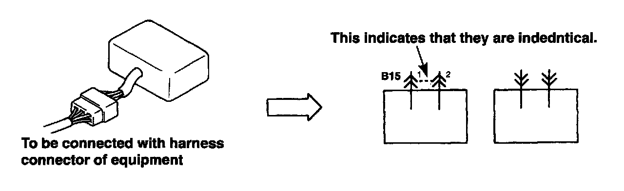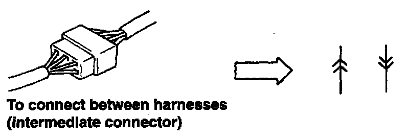 - The intermediate connector which connects harnesses is shown by both shapes of the male terminal and the female terminal but the connector to be connected directly to the equipment is shown by the shape of the connector on the harness side.
