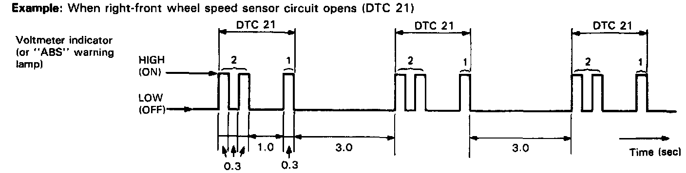 4. Read deflection of voltmeter indicator which represents DTC as shown in example below and write it down. When more than 2 DTC's are stored in memory, deflection for each DTC is repeated three times starting with the smallest DTC number in increasing order.