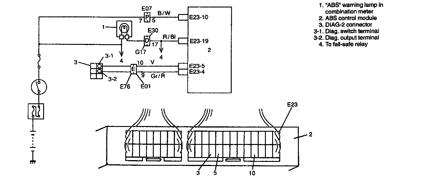 When the diag. switch terminal is connected to the ground with the ignition switch turned ON, the ABS control module outputs a diagnostic trouble code (DTC, voltage change signal) from the diag. output terminal. Connecting or shorting the diag. switch terminal and the output terminal will set the mode to clear DTC.