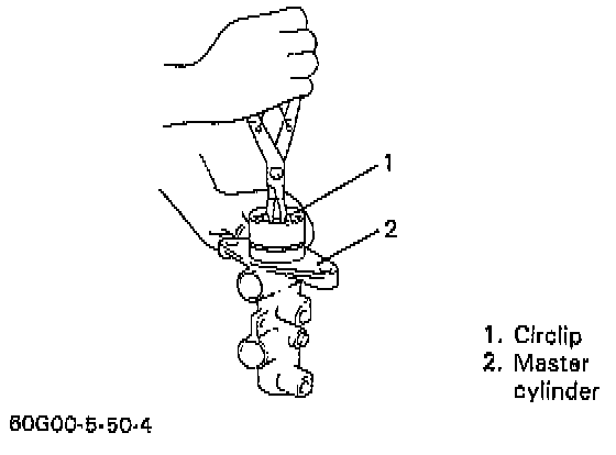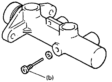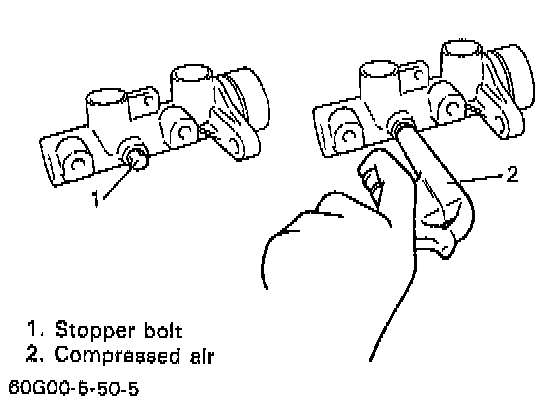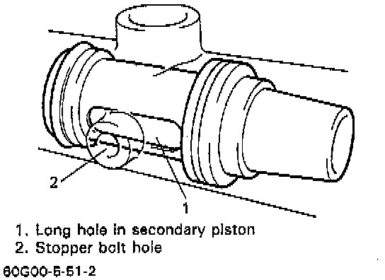 3. Remove piston stopper bolt. Then remove secondary piston by blowing compressed air into hole from which piston stopper bolt was removed. Be cautious during removal as secondary piston jumps out.