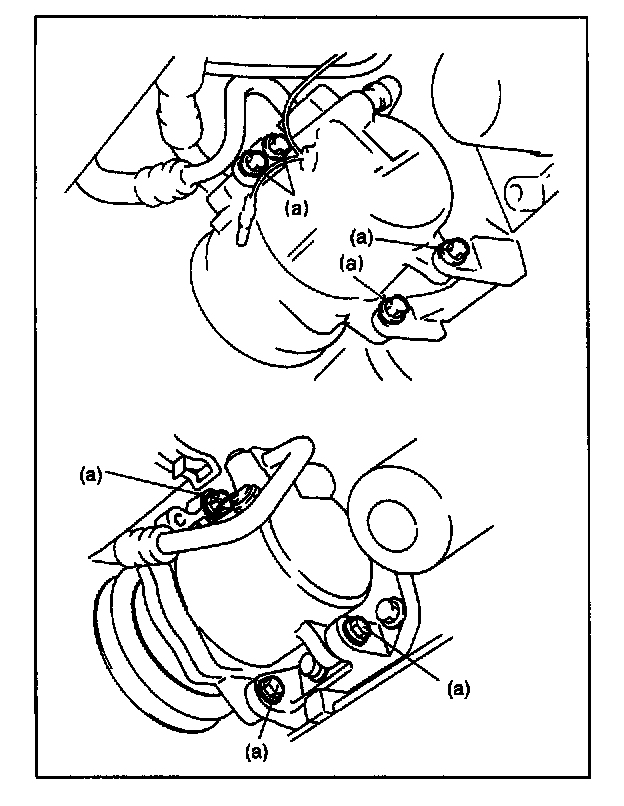 8. Loosen compressor drive belt, then remove compressor mounting bolts.