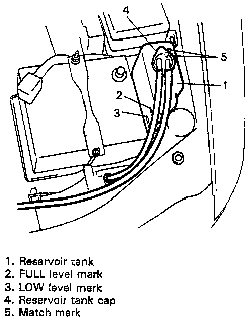 If coolant level is below "LOW" mark, remove reservoir tank cap and add proper coolant to tank to bring coolant level up to "FULL" mark. Then, reinstall cap and align match marks on tank and cap.