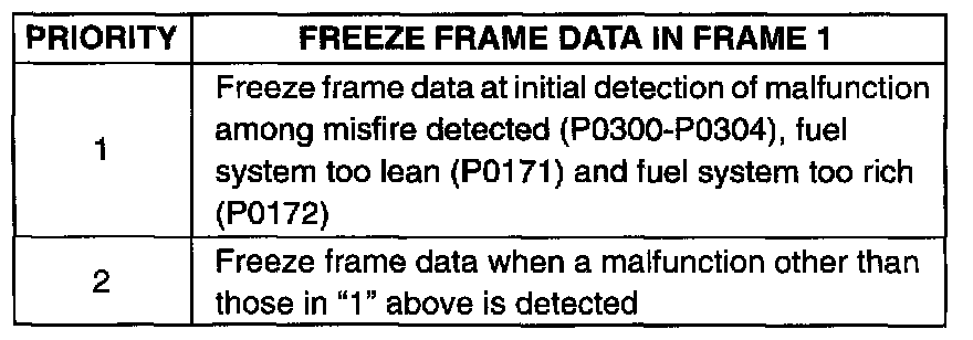 Shown in the table are examples of how freeze frame data are stored when two or more malfunctions are detected.