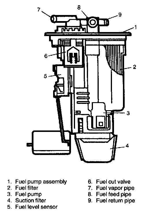 The fuel pump assembly consists of fuel pump, fuel filter, fuel level sensor and fuel cut valve.