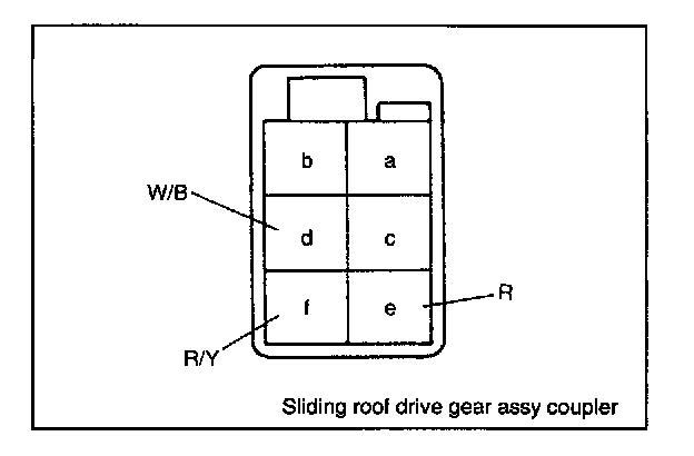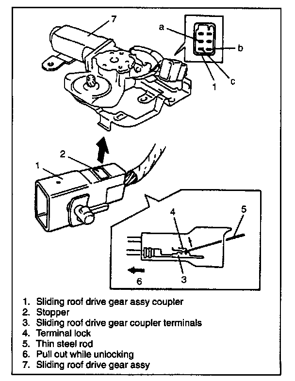 4. Pull out terminal a, band c from sliding roof drive gear assy coupler. To pull terminals out, first unlock stopper upward, then pull out wires (terminals) gently while unlocking the terminal lock. Terminals a, b and c are the limit switch wires.