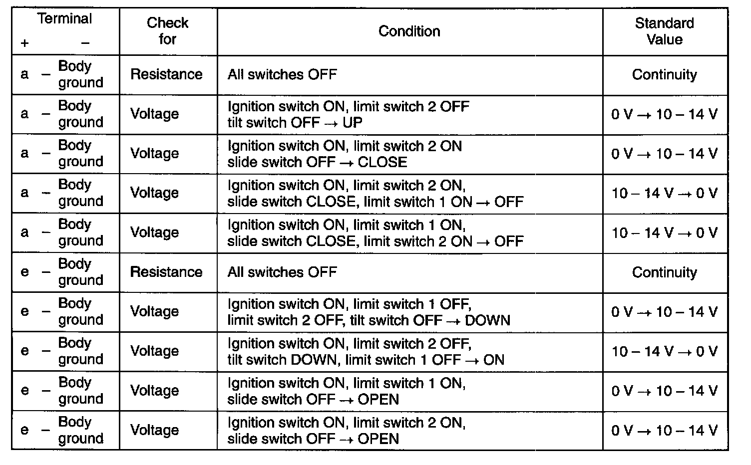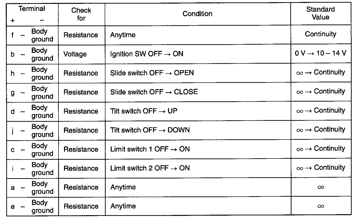 If any of measured condition does not follow above standard values, the problem exists on the vehicle, not on the sliding roof control relay.