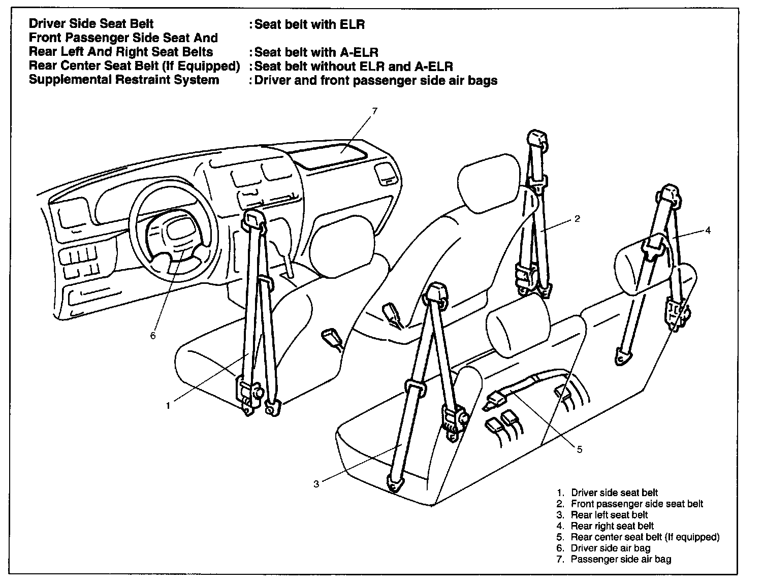 The seat belt with Emergency Locking Retractor (ELR) is designed so that it locks immediately (to prevent the webbing from being pulled out of the retractor any further) when any of the following items is detected as exceeding each set value; speed at which the webbing is pulled out of the retractor, acceleration or deceleration of the vehicle speed, and inclination.