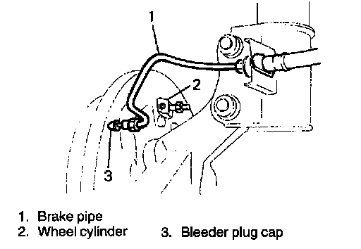3. Disconnect brake pipe from wheel cylinder and put wheel cylinder bleeder plug cap onto pipe to prevent fluid from spilling.