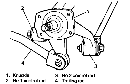 6. Loosen control rod outer bolts, trailing rod rear bolt and strut bracket nuts.