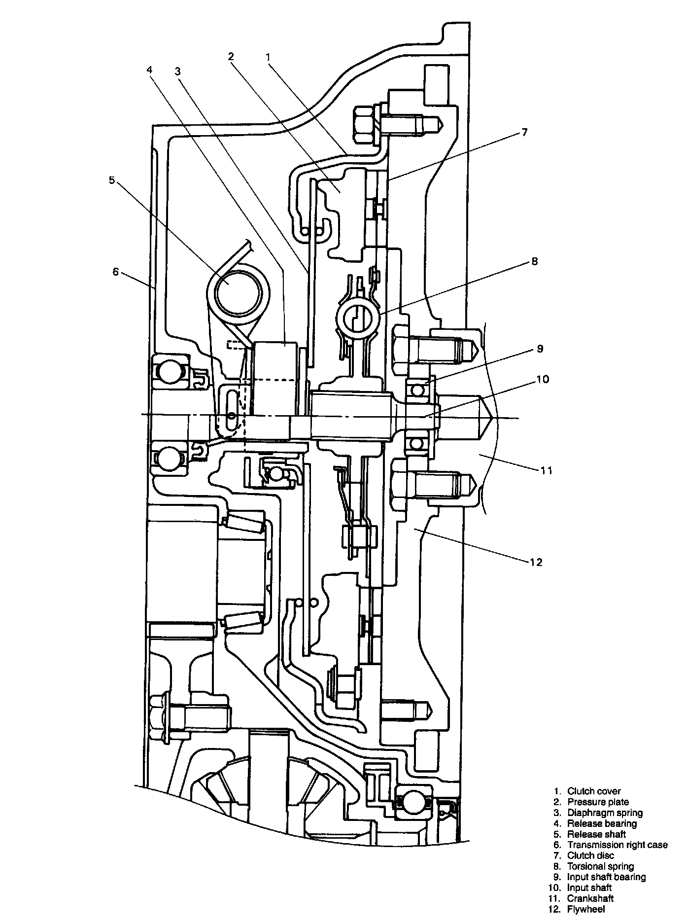 The clutch is a diaphragm-spring clutch of a dry single disc type. The diaphragm spring is of a tapering finger type, which is a solid ring in the outer diameter part, with a series of tapered fingers pointing inward.