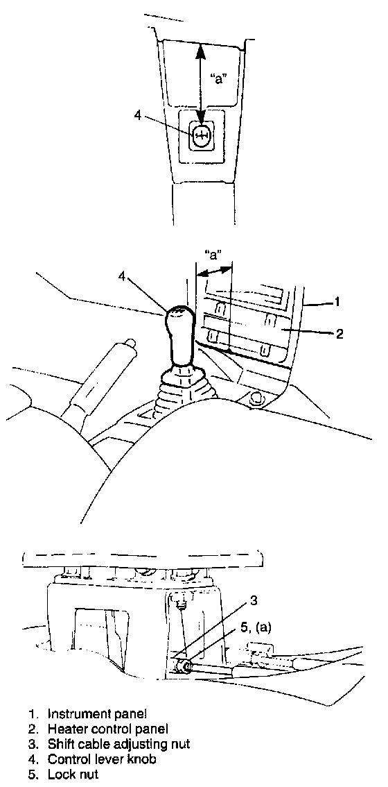 With shift lever in NEUTRAL position, adjust shift cable adjusting nut so that distance "a" between edge of instrument panel and center of shift knob measured as shown.