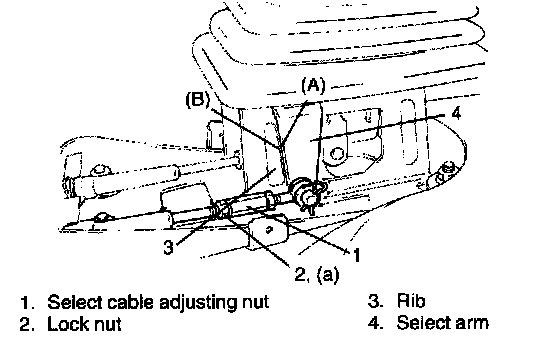 With shift lever in NEUTRAL position, adjust select cable adjusting nut so that front side end surface (A) of select arm and rear side line of rib (B) are aligned.