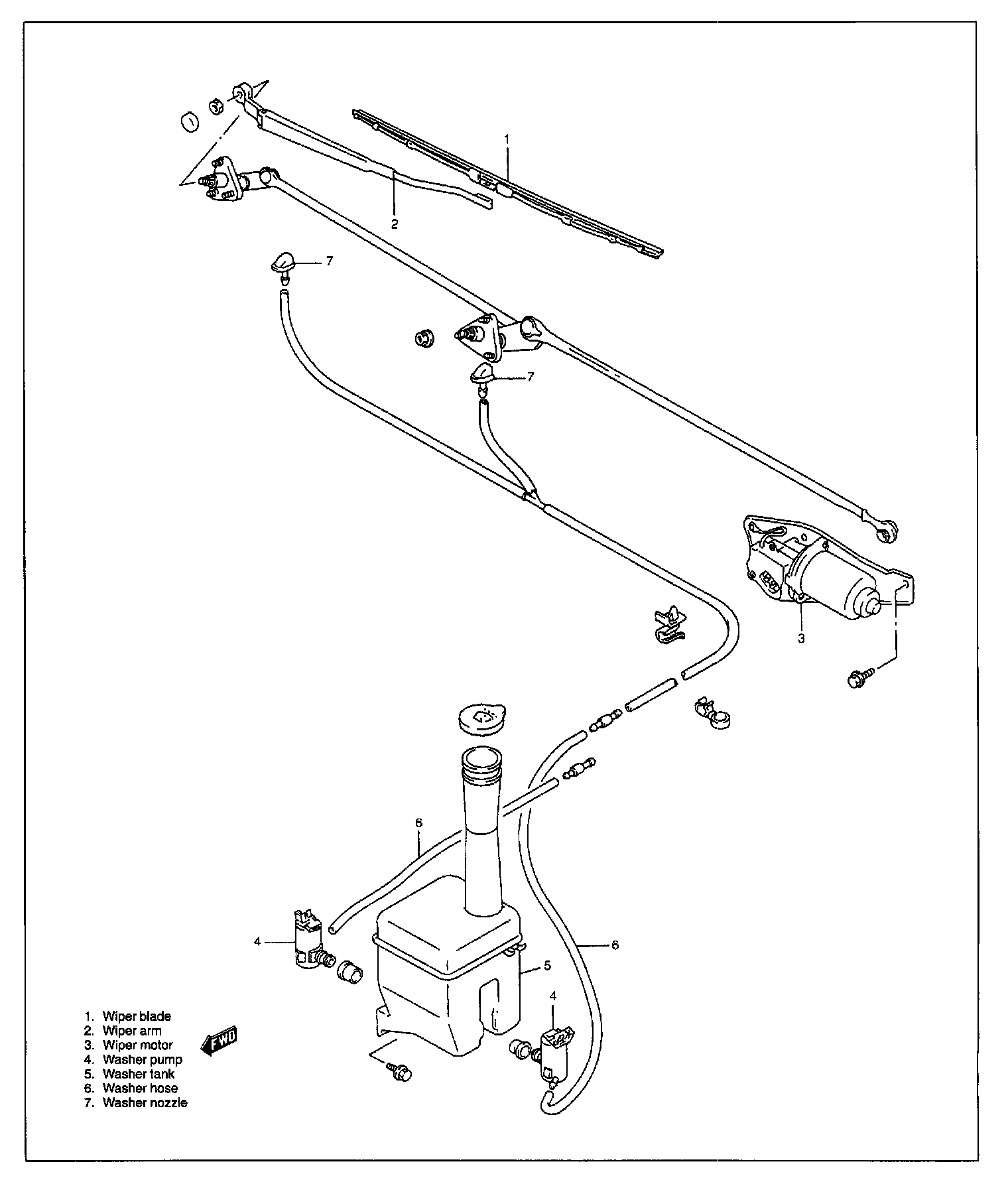 The windshield wiper is 3-speed type and the windshield washer is equipped with a separate-type washer pump. The washer tank is located inside of the front part of the left front fender. It has washer pumps for the front and rear respectively.