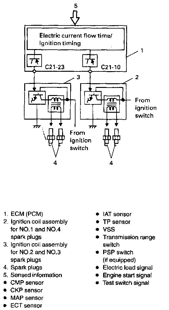 This system controls electronically the time of electric current flow to ignition primary coil as well as ignition timing. ECM (PCM) judges the engine and vehicle conditions by using signals from various sensors, selects the most suitable electric current flow time and ignition timing for that engine and vehicle conditions from among those prestored in its memory and sends an ignition signal to the igniter (power unit) in ignition coil assembly.