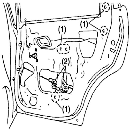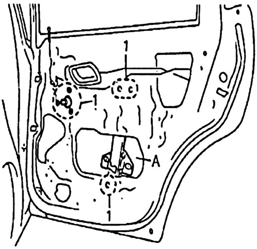 2. Remove door window regulator attaching screws (1) (six pcs.). Then, take out regulator through hole (A).