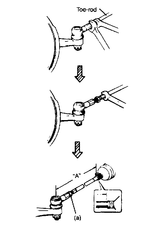 TOE ADJUSTMENTToe is adjusted by changing the tie rod length. Loosen right and left tie rod end lock nuts first and then rotate right and left tie rods by the same amount to align toe-in to specification. In this adjustment, right and left tie rods should become equal in length ("A" in the figure).