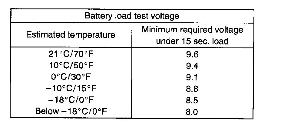 4. If voltage does not drop below the minimum as listed in the chart, battery is good. Temperature of battery will affect minimum voltage required to pass load test. See the chart and estimate the temperature battery has been exposed to for the last several hours.