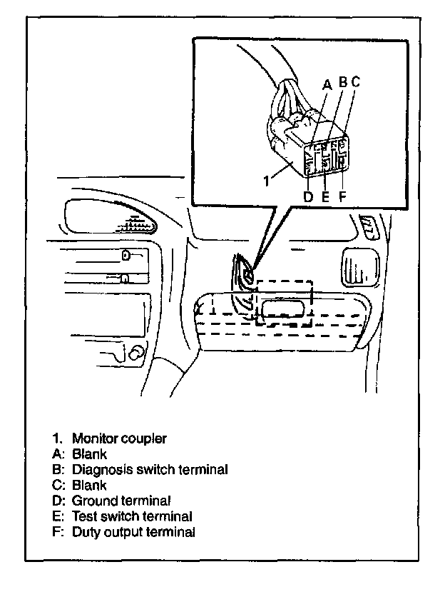 The diagnosis switch terminal is included in the monitor coupler installed under the instrument panel at the passenger's seat side. When the diagnosis switch terminal is grounded, a diagnosis signal is fed to ECM (PCM) which then outputs idle air control duty (IAC valve opening) through duty output terminal.