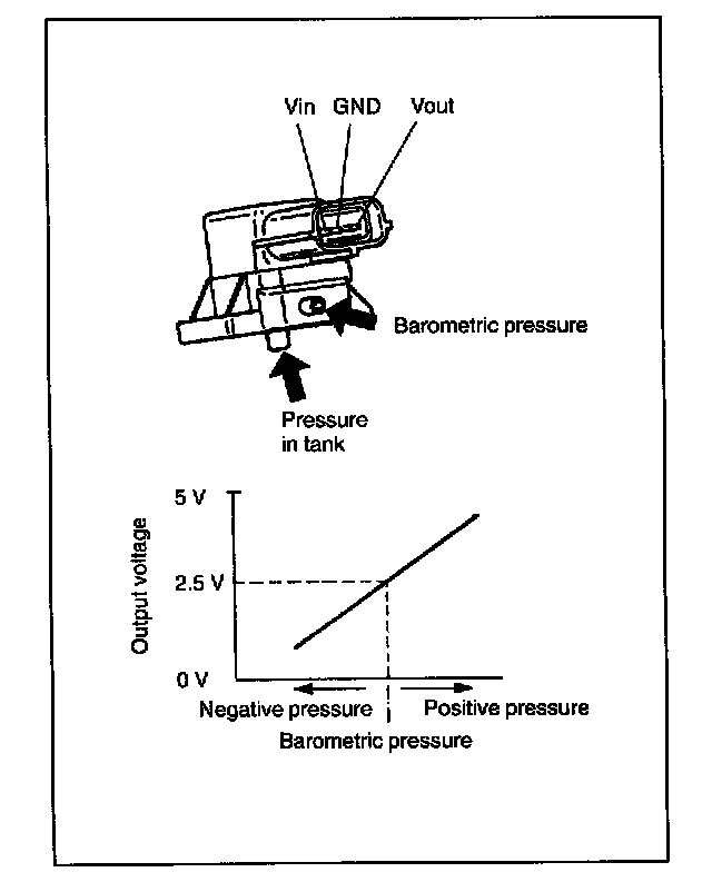 The sensor is installed on the fuel tank. It senses the fuel vapor pressure in the fuel tank as compared with barometric pressure and converts it into voltage signal. ECM (PCM) uses this signal as one of the signals to detect the EVAP system malfunction.