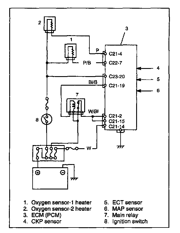 This system controls operation (ON/OFF) of each heater which assists activation of each oxygen sensor. ECM (PCM) turns the each heater of oxygen sensor-1 and -2 ON (to allow the electric current to flow to the oxygen sensor heater) when the engine is running without high-load condition after specified time from engine start.