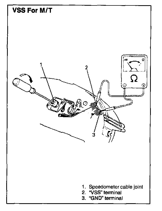 3. Connect ohmmeter between "VSS" terminal and "GND" terminal of combination meter and turn cable joint of speedometer with a screwdriver. Ohmmeter indicator should move back and forth between 0 (zero) and (infinity) 4 times while cable joint is turned one full revolution.