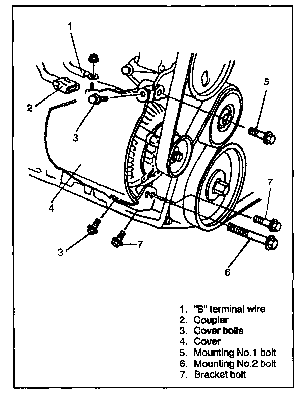 6. Remove mounting No.1 and No.2 bolts or bracket bolts. (Remove bracket bolts instead of No.2 bolt only when No.1 bolt can not be removed.)